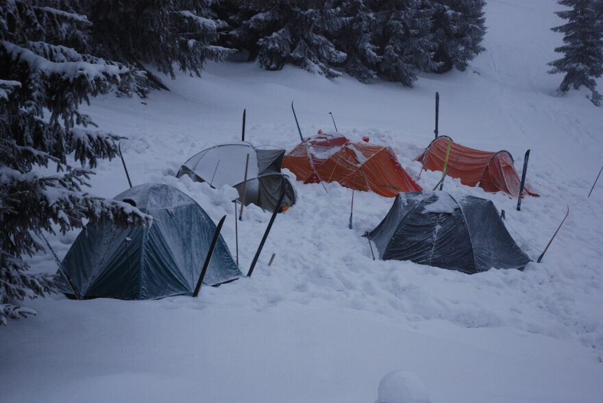 Kotvení stanu ve sněhu může usnadnit použití lyží nebo cepínů.