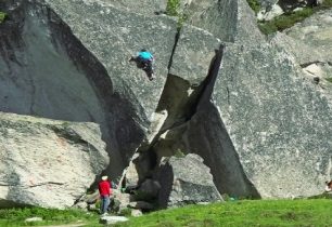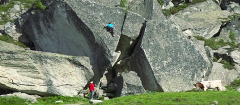 Bouldering je lezení na skalních blocích bez použití lana v „ bezpečné výšce“ od země, kdy většina kroků je obtížnějšího charakteru. Free solo lezení je některými označováno jako nejčistší forma tohoto sportu, takže se při něm lezou dlouhé cesty bez použití lana. Zkuste si domyslet, co může být „mezi“?