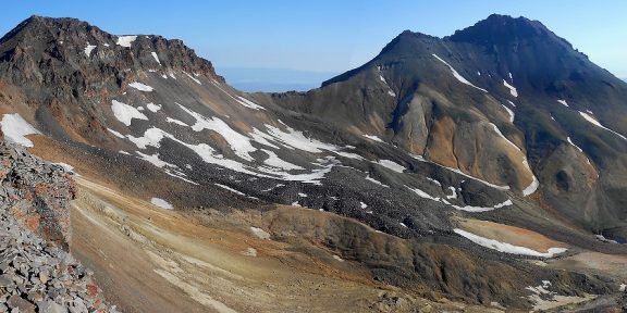 První přestávku jsme udělali v sedle mezi jížním a západním Aragatsem, odkud jsme mohli pozorovat sebevražednou dvojici, která se snažila traverzovat kamenolom východní stěnou západního Aragatse. Místní kolega na ně volal, ať se vrátí, že je jejich aktivita příliš nebezpečná, nicméně ti na to nedbali, a pokračovali dále s množstvím kamení a skal uvolňovaných a padajících dolů. Poměrně náročným terénem jsme sestoupili do širokého údolí mezi čtyři vrcholy. Z jižního směru nám celou dobu “svítil” na cestu ledem a sněhem pokrytý vrchol Araratu (5136 m) vystupující z oparu.