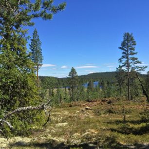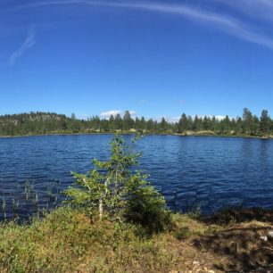 Následujících 40 km vede divokou přírodou. Šlapeme přes náhorní plošinu (asi 800-900 m n.m.), procházíme kolem několika jezer (např. Skårsjøen) a užíváme si krásné pohledy na okolní hory. Cesta rychle utíká a my se blížíme do města Tynset, před kterým následuje náročné klesání.