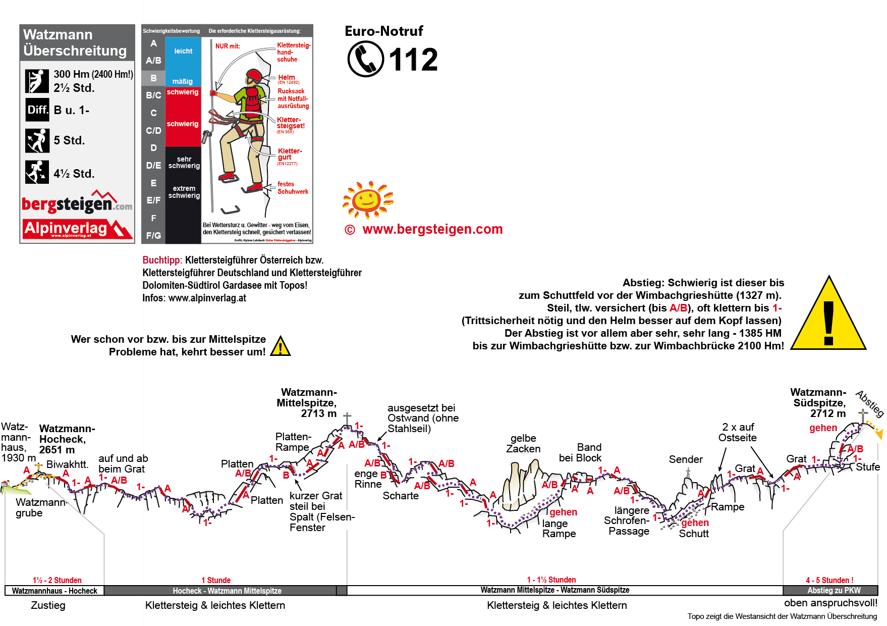 Ferrata neodpovida B, ale rozhodne C/D, dosti exponovane, z Mittelspitze na Sudspitze zajisteno velmi usporne, postaru, (tycka tycka, ne lana) zajisteni se casto kyve, nekolik traverzu zcela bez jisteni cesticka posypana suti nad kilometrovou propasti nad Konigsee… A jeste je to ukrutne dlouhy.