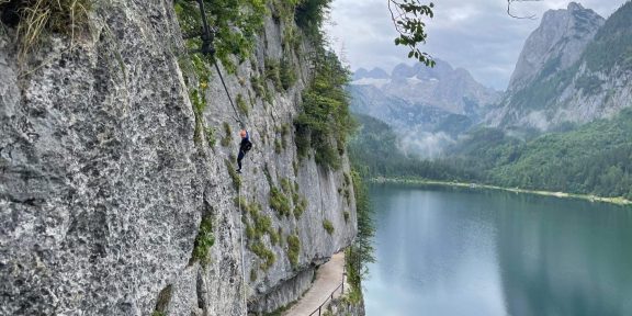 Hravá, krátká, cvičná, středně těžká ferrata Laserer Alpin Klettersteig (C) vede okruhem ve skalní stěně nad malebným jezerem Vorderer Gosausee v Solné komoře v rakouských Alpách. Vyzkoušíš si na ní lezení traverzem i v kolmé stěně, výstup po žebříku i přechod vzdušného lanové mostu.