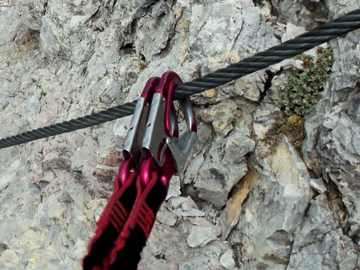 Via ferrata Masaré KS3-C, krátký obtížný traverz nad stěnou Fensterlwand bez stupů. Sestup z vrcholu Rotwand do sedla Vajolonpass snadný (KS2-C)