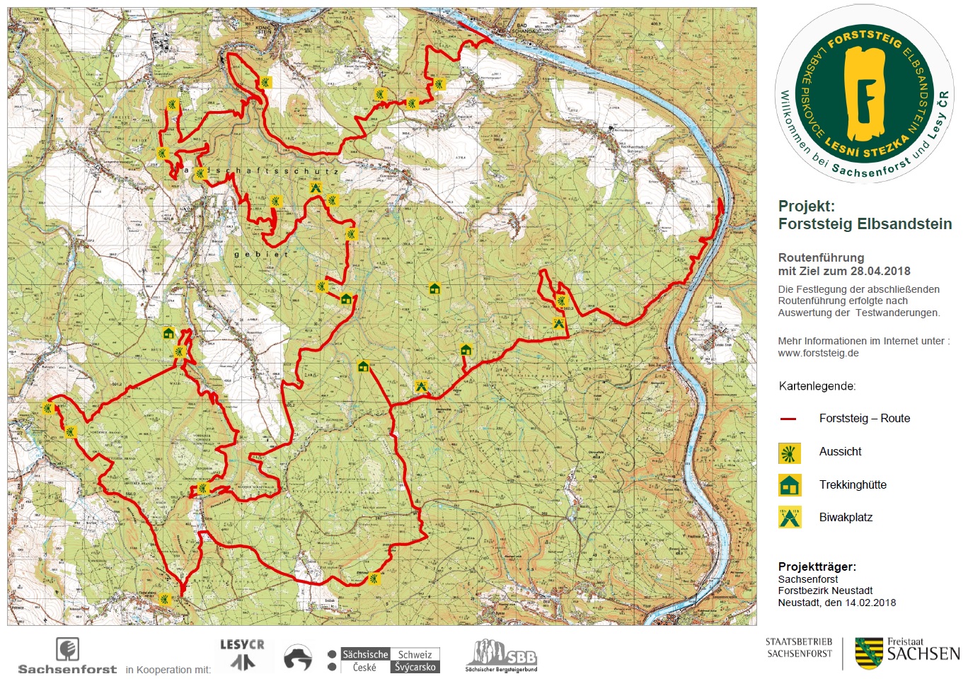Mapa Forststeig Elbsandstein, v překladu Lesní stezka Labské pískovce,