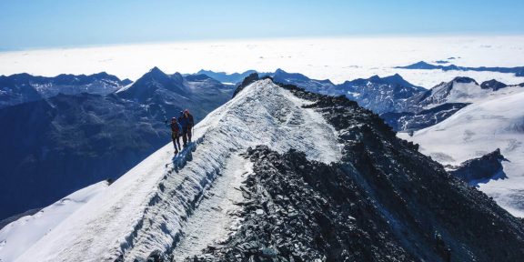Slunce vychází zpoza temných čtyřtisícových obrů, Lagginhornu a Weissmiesu, a rozlévá své první paprsky po zaledněném území Wallisu, nejvyšší části celých Alp a Evropy. Jste vděční, že vás konečně trochu zahřeje, přestože údolí dole jsou stále potemnělá a většina lidí ještě spí. Vy už pravděpodobně začínáte cítit na plicích vyšší nadmořskou výšku – nacházíte se v 3 350 m n. m. – ale už není na co čekat, je potřeba opět vyrazit. Lákavým, sněhovo-ledovým hřebenem, který se teď blyští v záplavě slunečních paprsků vysoko nad vašimi hlavami. Na vrchol zbývá ještě 700 výškových metrů.