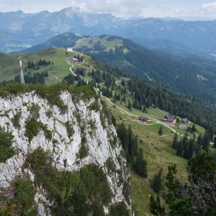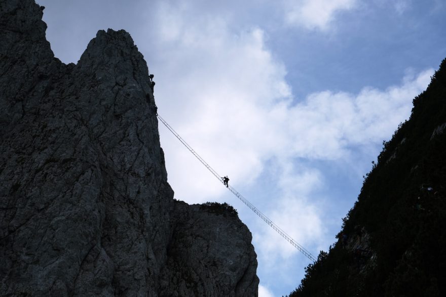 Ferata pokračuje lehčími úseky A/B s jedním C úsekem až k první únikové cestě. Další třetina feraty pokračuje sice poměrně lehčími ale v jedné části blátivými a velmi kluzkým úseky A/B nebo B/C k traverzu A pod vrcholem Kleiner Donnerkogel, který je zajištěn jen lanem a který nás dovede až k nástupu A/B a B/C na pověstný žebřík, kde také začíná poslední a nejhezčí třetina feraty.