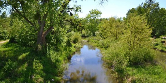 Modrá značka dál pokračuje společně s červenou půl kilometru polní cestou s třešňovou alejí na okraj obce Měnín. Odtud je to po červené značce kilometr chůze k Arboretu Bílá Lhota; my však pokračujeme dál po modré polní cestou s hezkými výhledy na Litovelské Pomoraví i Zábřežskou vrchovinu. Kolem kapličky sejdeme do obce Řimice, kde se připojí žlutá značka od Bílé Lhoty. Za obcí se podchodem pod dálnicí dostaneme na polní cestu a dáme se vlevo přes louky. Po kilometru chůze jsme na silnici u vodní elektrárny, vedle níž se nachází soukromá obora se stádem bizonů.