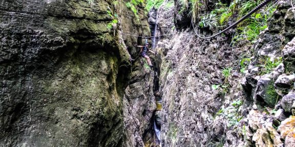Dschungelbrücke (B/C): Příjemnou pěšinou s pěknými výhledy se pokračuje po hraně soutěsky. Přes potok Wieslerbach vede poslední zajištěná pasáž – a to přes lanový most, odkud míří stezka na planinu Postalm.