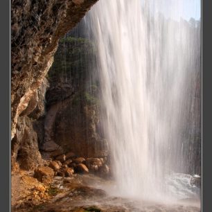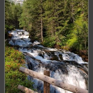 K odbočce ke spodnímu vodopádu je to jen cca 50 m. Jsme ve výšce 1490 m a po skalní římse doplněné lanovým jištěním se dostáváme přímo pod přepad vodopádu Cascata di Fanes. Škoda, že není vidět dolů, kde se vodopád tříští o dno průrvy. Skalní stupeň, po kterém lze přejít na druhou stranu řeky, jej dělí na dvě kaskády – výrazně kratší horní a mnohem delší dolní a celková výše vodopádu je cca 100 m.