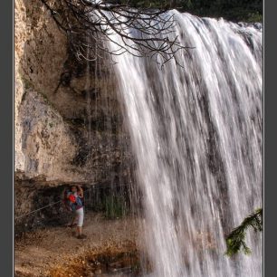 I tato cesta nahoru nad vodopád je značená jako ferrata (Via Cengia Matia) – ale je to jen pár metrů po několika železných skobách bez nutnosti nějakého jištění.