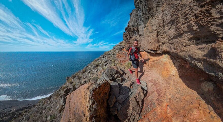 Můj další cíl je pobřeží – La Aldea de San Nicolás. Daleko mimo známou GR131, za to s útesy a plážemi, kterých se na nejznámějším treku Gran Canarie nedočkáš. Trasa vede po GR139 v podstatě pustinou. Nikde nikdo. 20 km táhlého nekonečného klesání s převýšením minus 1500 metrů. Kolena brečí, pohled na oceán léčí. Pozor na to, že od Artenary až do La Aldei (cca 22 km) není možnost doplnit zásoby ani vodu.