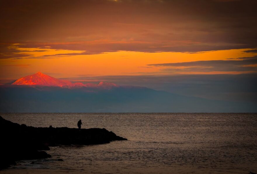 Plánoval jsem se na noc zašít někde pod bukem u hlavní pláže, ale cestou po útesech vidím malou skrytou pláž s černým pískem. Že první noc v jeskyni nic nepřekoná? Pche! Právě se stalo. Hned u pláže je skalní převis s do půlkruhu naskládanými kameny. Ideální spací flek s výhledem na západ slunce nad mořem a ráno dramaticky osvětlený vrchol Pico del Teide. Wow.