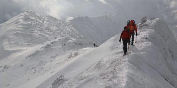Úzký hřeben je kvůli převějím neschůdný, musí se postupovat svahem, kde buď ujíždí sypký prašan, nebo se opatrně musíme zasekávat předními zuby sněžnic do zmrzlého sněhu a postupovat bokem. Ti, co mají mačky, si celkem hvízdají. Rozhodně doporučuju nepodcenit podmínky a do batohu zabalit minimálně mačky a cepín. Před našima očima tu backcountry běžkař jen na botách podklouzl a jak namydlený ujížděl několik stovek metrů do údolí. Naštěstí se jen pořádně vykoupal ve sněhu a nic se mu nestalo.