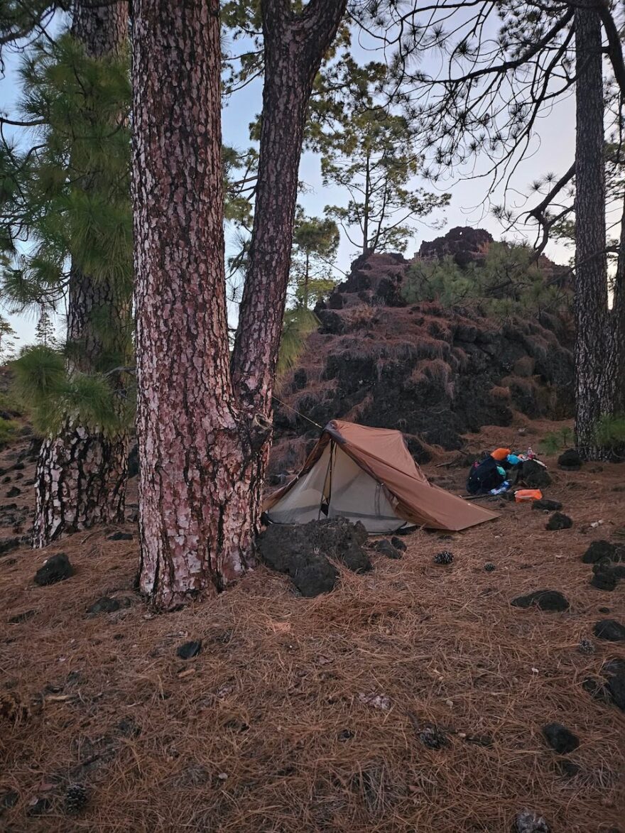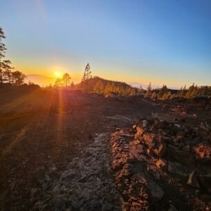 Cesta pokračovala stále po žluté PR-TF 43.1 tentokrát krásným voňavým borovicovým lesem, zde už opravdu bylo znát že zeleň ubývá. Po výstupu k rozcestníku pod Montaña Negra se naskytne opravdu nádherný pohled na majestátní Pico del Teide. Najednou jste v úplně jiné krajině, všude černý štěrk a oproti tomu krásně zelené borovice. Všimla jsem si, že podél cesty vede nějaký betonový kanál, zvědavost mi nedala a když jsem uviděla poklop, šla jsem ho otevřít.. byla tam voda! Doplnili jsme zásoby a pokračovali dál. Bylo již odpoledne a nám zbývalo jen pár kilometrů k oficiálnímu kempovacímu místu, kde jsem měla opět udělaný booking na jednu noc. Bylo tu rušno, spousty místních tu grilovalo, popíjelo a nám se tu popravdě moc nelíbilo. Pořešili jsme si osobní hygienu a rozhodli zde nenocoval a pokračovat dál po žluté PR-TF 43. Bylo to dobré rozhodnutí, úsek, okolo sopky Chinyero je fakt krásné místo a stojí za návštěvu. Po pár kilometrech jsme opustili značenou trasu a vydali se směrem k místní cyklostezce a dále k hlavní silnici. Před západem slunce jsme si našli krásné, odlehlé místo poblíž jeskyně Cueva de Samara s panoramatickým výhledem na západ slunce a usínali nad mraky v nadmořské výšce 1650 m.