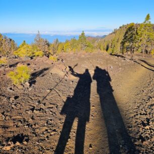 Spali jsme pod dvěma borovicemi což byla ta nejlepší volba, byl zde nános jehličí a já měla pocit, že se zde spí jako v trávě. Dnes nás čekalo pořádné stoupání na Pico Viejo (3134 m), kde jsme museli přenocovat před výstupem na Pico del Teide. Budíček v šest, balení, rychlá ovesná kaše k snídani a jde se na to! Vyrazili jsme v osm po neznačené cestě k hlavní silnici, já jsem obdivovala všude přítomné obrovské šišky a musela jsem se přemlouvat, abych jednu nestrčila do báglu. Napojili jsme se na fialovou trasu č.9 a stále pomalu stoupali, nad námi bylo nebe blankytně modré a slunce opět pálilo, tady se nebylo před sluncem kam schovat! Prošli jsme lávová pole a napojili se na fialovou trasu č. 9 která vede až k vrcholu Pico del Teide.