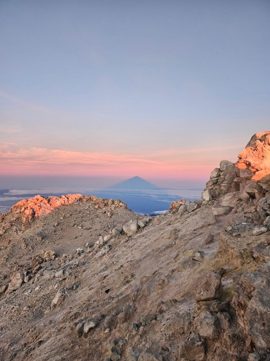 Časově nám výstup trval přesně podle plánu a my byli v šest hodin ráno u horní stanice lanovky, tady tedy fučel ledový vítr a bylo tak kolem nuly. Odložili jsme naše batohy, oblékla jsem si péřovku vzala pití a malé překvápko a šlo se vzhůru, cesta byla najednou úplná pohoda bez 8 kg báglu. Tady už jsme sami rozhodně nebyli, přicházeli další turisté převážně od Montaňa Blanca. Na samotný vstup na vrchol musíte opět mít rezervaci a permit, což jsem měla zajištěný. Realita byla taková, že branka byla otevřená a strážci parku tu tak brzo ještě nebyli. Na vrcholu Pico del Teide, byla znatelně cítit síra, byla zima, a tak se hodilo ohřívat se ve skulince mezi kameny, kde unikala horká pára.