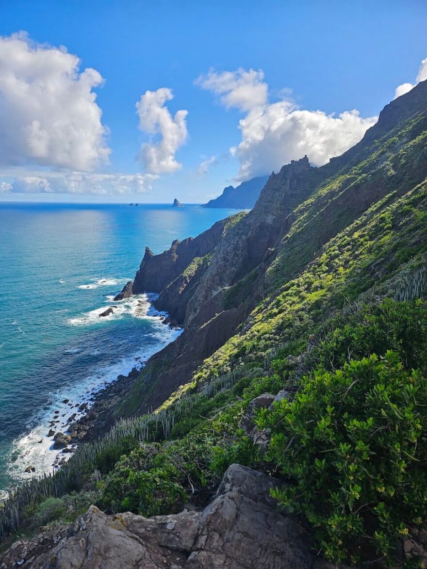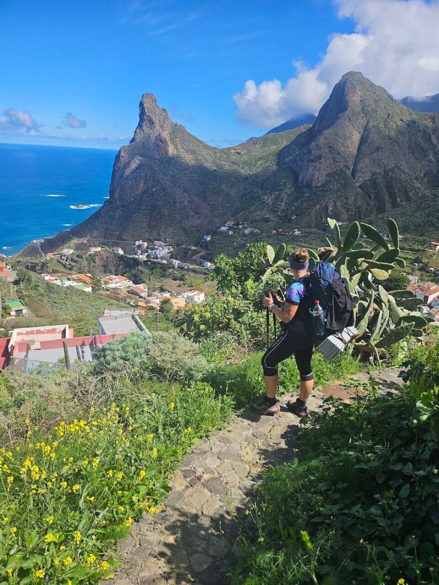 Sestup už bude jen nekonečné kličkování po úzké cestičce mezi kameny zleva doprava, prudce dolů. Na trase GR 131 potkáte pár podobných nadšenců a budete procházet krajinou, kterou pohltil v roce 2023 požár. Můžete tak sledovat, jak je příroda mocná a postupně se uzdravuje. Jako balzám na duši, budou neskutečné nádherné výhledy při cestě podél pobřeží v Anaga a všude přítomné kvetoucí kytičky. Půjdete za zpěvu žab a unavené nohy si můžete zchladit v potůčku či rovnou v oceánu. V Anaga už nouze o vodu není. Tato trasa je náročná na časté stoupání a klesání, ale je nádherná a určitě stojí za to!