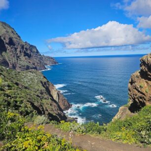 Noc jsme přežili, hladový psi nás neroztrhali ani nás nepřepadla bláznivá ukřičená ženská. Ráno v šest byl všude klid a ticho, ideální čas sbalit se a nenápadně zmizet. Klesali jsme do údolí, poté opět stoupali do kopců, kilometry tu nepřibývali zrovna rychle – ale nádherných výhledů je tu bylo víc než dost. Všude rostou obří opuncie, kaktusy a nejrůznější sukulenty a květiny. Procházeli jsme vesničkou Afuf, kde byl na náměstí otevřený kostelík. To jsem si nemohla nechat ujít, a nakoukla jsem dovnitř. Nedaleko byl malý obchůdek, kam nás zval místní stařík. Prodával tu různé dobroty a pití, ale vzduch zde byl strašně cítit cigaretovým kouřem a některé potraviny měli lehkou vrstvu prachu. V nouzi bych tu možná něco koupila, ale tentokrát jsem raději s díky odcházela. Cesta dál klesala údolím po žluté PR-TF 8 směrem k moři. V Anaga už nouze o vodu není, tečou tu potoky, hlasitě kvákají žáby. Některé úseky stezky jsou zabezpečené zábradlím nebo lanem na přidržení. Chtěla jsem konečně k moři, sešli jsme k pláži Tamadite, kde divoký oceán narážel do kamenů. Koupání jsme tady riskovat nechtěli, a tak jsme pokračovali vzhůru směrem k městečku Taganana. Stoupání bylo náročné, ale odměnou byli dech beroucí výhledy. Tahle část trasy je opravdu nádherná a nám počasí přálo a slunce neskutečně pálilo.