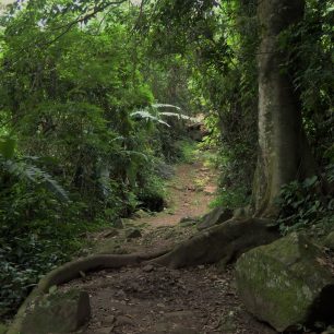 Stezka tropickým lesem podél pobřeží laguny Lagoa da Conceição za rybářskými usedlostmi a tajuplným hradem.