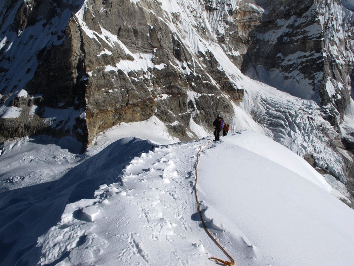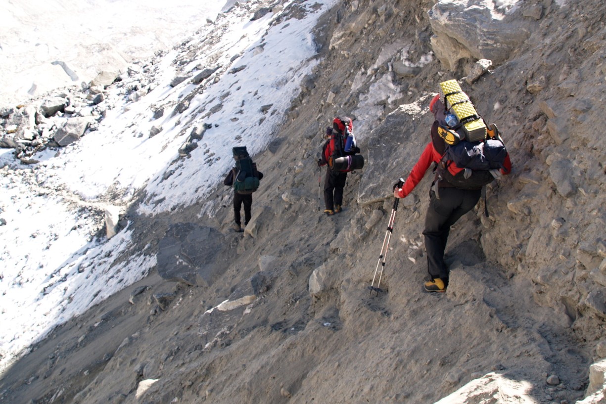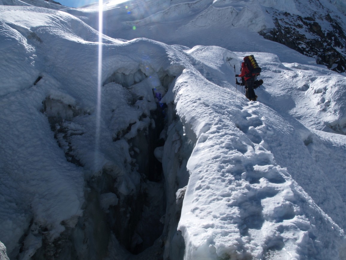 Před sedmou ranní hodinou vyrážíme po suťovisku vstříc nejtechničtějšímu úseku treku. Vytahujeme lano a zajišťuji první úsek. Ve skále jsou skoby, takže odjištění není problémem. Klasifikace I UIAA, ale s 30-35kg batohy na zádech to zas sranda taky není. Kousek volného lezení a následují dvě délky v ledovém mixu s mačkami a cepínem. Konečně jsme na náhorní plošině. Dále pokračujeme po zamrzlém sněhu po ledovci. Výška opět bolí. Jdeme jen co noha nohu mine a zhluboka dýcháme. Kroutící se had zmrzlé vyšlapané stopy nás vede přes rozpraskané séraky a rozškubaný ledovec. V dáli je vidět závěrečný výšvih do sedla. Batohy těžknou na zádech a nám je jasné, že budeme muset udělat ještě jeden bivak, než překonáme sedlo.