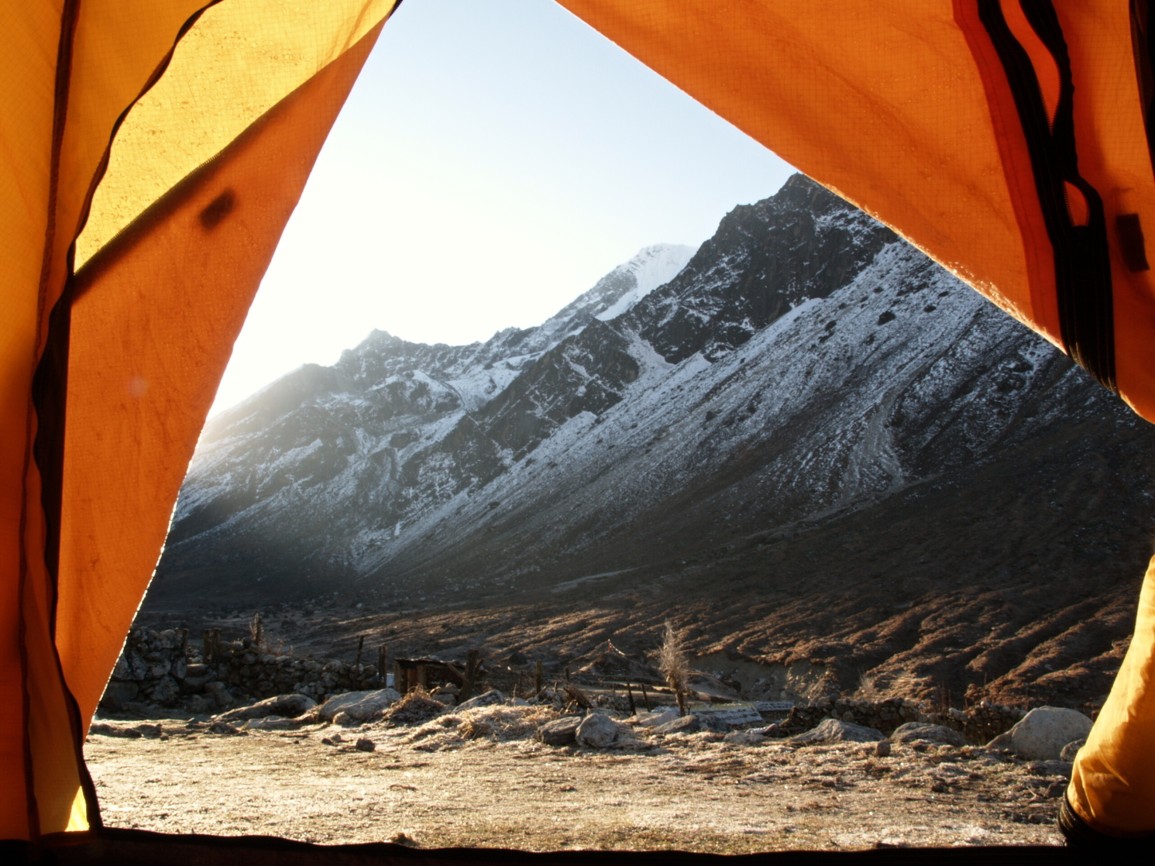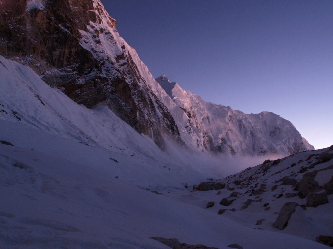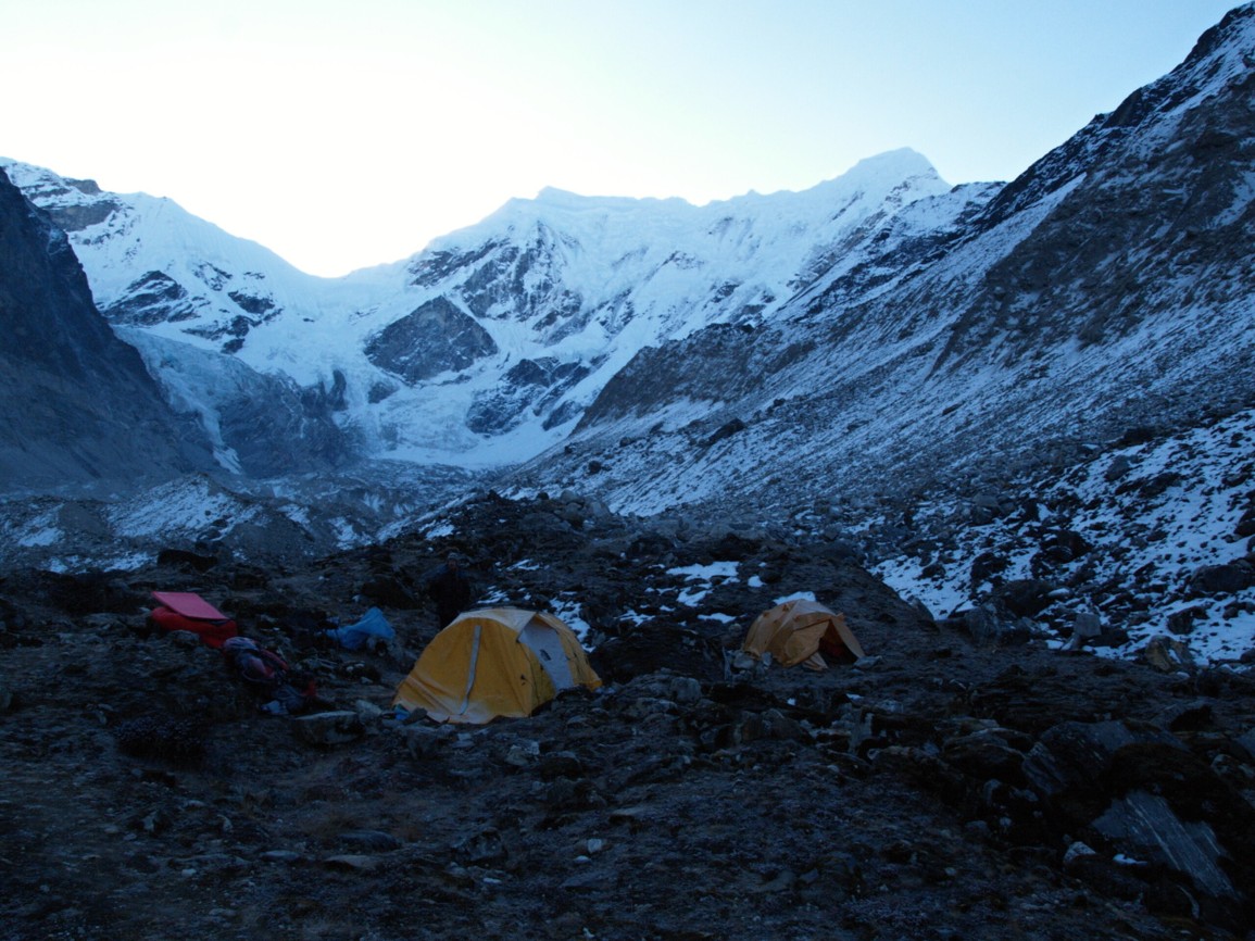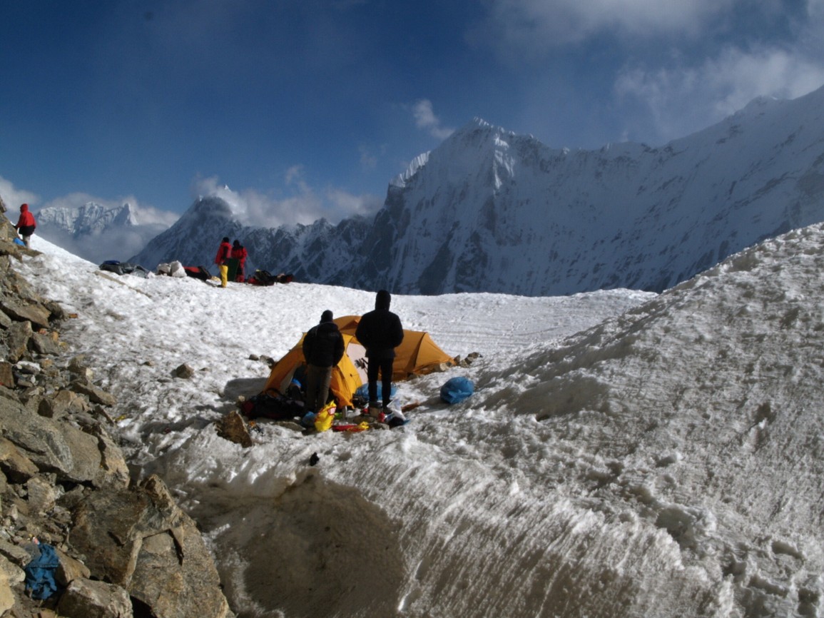 Jsme ve výšce 5375 m a na malé plošince stavíme stany. Pomocí cepínu kutáme lodovcovou drť, vaříme kaši a tekutiny. Údolím se valí mlha, ale okolní vrcholky jsou stále osvětleny zapadajícím sluncem. Úžasný západ slunce mě donutí vylézt ze spacáku, abych pořídil záběr usínajícího himalájského údolí zalitého červánky. Začíná závěrečný boj o zdolání naší mety sedla Tesi Lapcha. Ledovým ránem, za zvuku vrzajícího sněhu pod nohama se krok za krokem posouváme výš a výš. V zápětí nám ostré paprsky slunce prohřívají naše prokřehlá těla. Těžce se nadechujeme a pomalu postupujeme strmě vzhůru. Ještě je potřeba obejít velkou trhlinu a před námi se objevuje závěrečné stoupání do sedla.