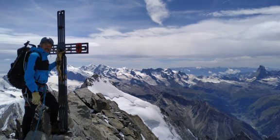 Marně čekám, kdy se objeví ta kvalitní pevná skála uváděná v topu. Poslední strmý výšvih a stojíme u dnešního druhého kříže. Dom je náš! Dáváme dlouhou pauzu. Sestup je ještě štreka. Nasazujeme mačky, do jedné ruky k cepínu přidáváme hůlku. Začínáme poslední etapu našeho dobrodružství. Sestup po ledovci je dlouhý a únavný. A obří trhliny solidně potrénují naše soustředění. Přes Festijoch už se přehupujeme jen silou vůle. Ještě naposledy vytočíme dlouhé lano a doufáme, že všechny mosty budou v srpnovém slunku držet. Pro sichr na něm nadělám o pár uzlíků víc.