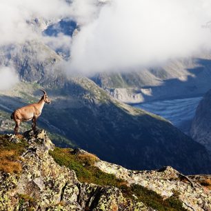 Ještě je šero a tak sedím u vody a koukám, jak se protější vrcholy Montblanského masivu začínají pozvolna rýsovat proti tmavé obloze, výborné ráno. Nikde ani živáčka, společnost mi opět dělá jen opodál se pasoucí stádečko bezstarostných Kozorohů. Chvíli mě zkoumá vůdčí koza, ale velice rychle usuzuje, že jsem úplně neškodný a pasou se klidně dál.Zvědavá mláďata jdou div ne až na dosah ruky.