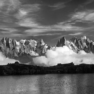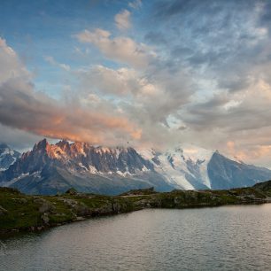 Za necelé tři hodinky stojíme konečně na břehu vytouženého a během cesty také několikrát proklínaného jezera, od kterého bych v následujících dnech rád fotografoval východy a západy slunce. Rázem jsou útrapy s výstupem sem nahoru zapomenuty. No dnes to však moc na fotografování nevypadá, vrcholek Mont Blancu se nám od našeho příjezdu do oblasti ještě v celé své kráse neukázal a mraky zakrývají i ostatní vršky okolních kopců.