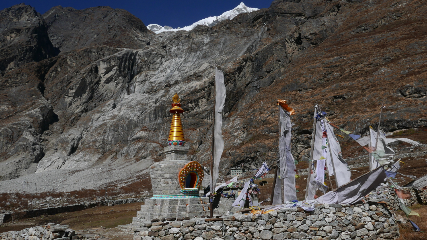 Druhý den vyrážíme brzo, čeká nás ambiciózních 800 výškových metrů. První den byl trochu rozpačitý, sevřené údolí v hustém lese a burácející řeka, ale údolí se nyní mění a otevírá. Poznáváme jedle a jedlovce, ale zničehonic přichází barevný podzim. Děti neminou jedinou příležitost rozvířit spadané javorové listí. Za křivými mechem pokrytými větvemi cesmín se objevuje Langtang Lirung se 7234 m, nejvyšší vrchol v oblasti. Jsme v suchém širokém údolí, objevují se první trnité dřištály a růže. Výhledy už nic nezakrývá.
