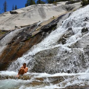 Medvěd tentokrát nepřišel, zato na snídani se stavil drzý svišť, kterých je tu požehnaně, lidí se nebojí a v klidu se sluní na placatých kamenech. Vyrážíme na nejdelší 25 km dlouhý úsek do údolí jedné z nejvýznamnějších řek Yosemit – Merced. Úzkou pěšinkou po travnaté planině míříme k menšímu jezeru Fletcher, odkud volíme o něco náročnější, ale méně frekventovanou trasu přes sedlo Vogelsang (3250 m), z něhož se otvírá úchvatný výhled na prstenec hor ozdobený temně modrými safíry jezer. V údolí říčky Lewis Creek si užíváme samotu hor a také osvěžení pod vodopádem, který stéká po žulových plotnách do ledové tůňky. U jezera Merced (2220 m) míjíme tábořiště a dál klesáme kaňonem stejnojmenné řeky, ostře zaříznutým v několika zákrutách do úbočí žulových masivů. Stany stavíme na malé skalní plošině nad řekou a za tmy se koupeme na Evu v azurové tůni pod vodopádem Bunnell Cascade.