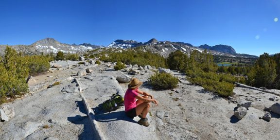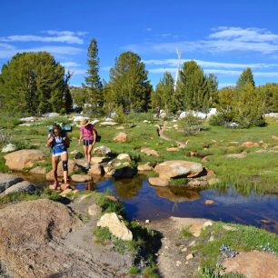 Hurá jsme na cestě! Ze záchytného parkoviště (zdarma, za okno auta se dává povolenka s předpokládaným návratem) v Tuolumne Meadows (2650 m) vyrážíme do divočiny. První kilometry kopírujeme trasu věhlasného dálkového treku Pacific Crest Trail, který vede po páteři západního pobřeží USA v délce 4200 km od mexických hranic až do Kanady, a také méně známého John Muir Trailu, 300 km dlouhé trasy pojmenované po americkém průkopníkovi ochrany přírody vedoucí napříč pohořím Sierra Nevada. Po mostě Twin Bridge překonáme průzračné tůně říčky Lyell Fork a procházíme širokým ledovcovým údolím Lyell Canyon.