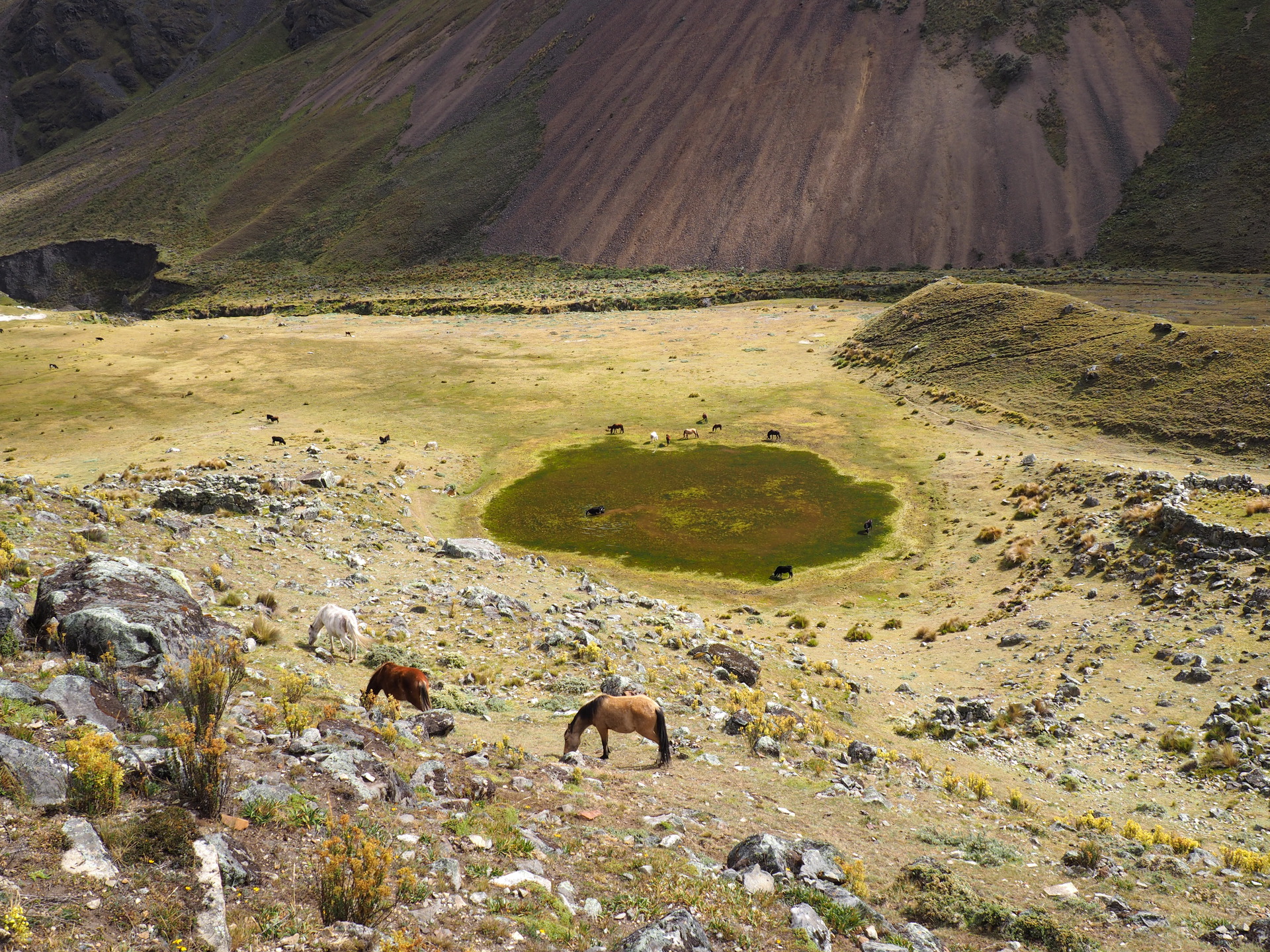 Z doliny Quebrada Alpamayo přecházíme 4820 metrů vysokým sedlem Gara Garado nádherně zelené doliny Quebrada Mayopampa. Ohlédneme se za Alpamayem i obrovským Nevado Cruzem a na pár hodin vyměníme výhledy na zaledněné velikány za nekonečné zelené jihoamerické horské louky, na kterých se pasou obrovská stáda divokých koní. S deštěm v zádech přeskotačíme přes průsmyk Mesapata (4460 m), ze kterého se nám otevře výhled na zaledněný masiv NevadoPucajirca, a pak sklesáme spoustu výškových metrů do další doliny Quebrada Tayapampa.