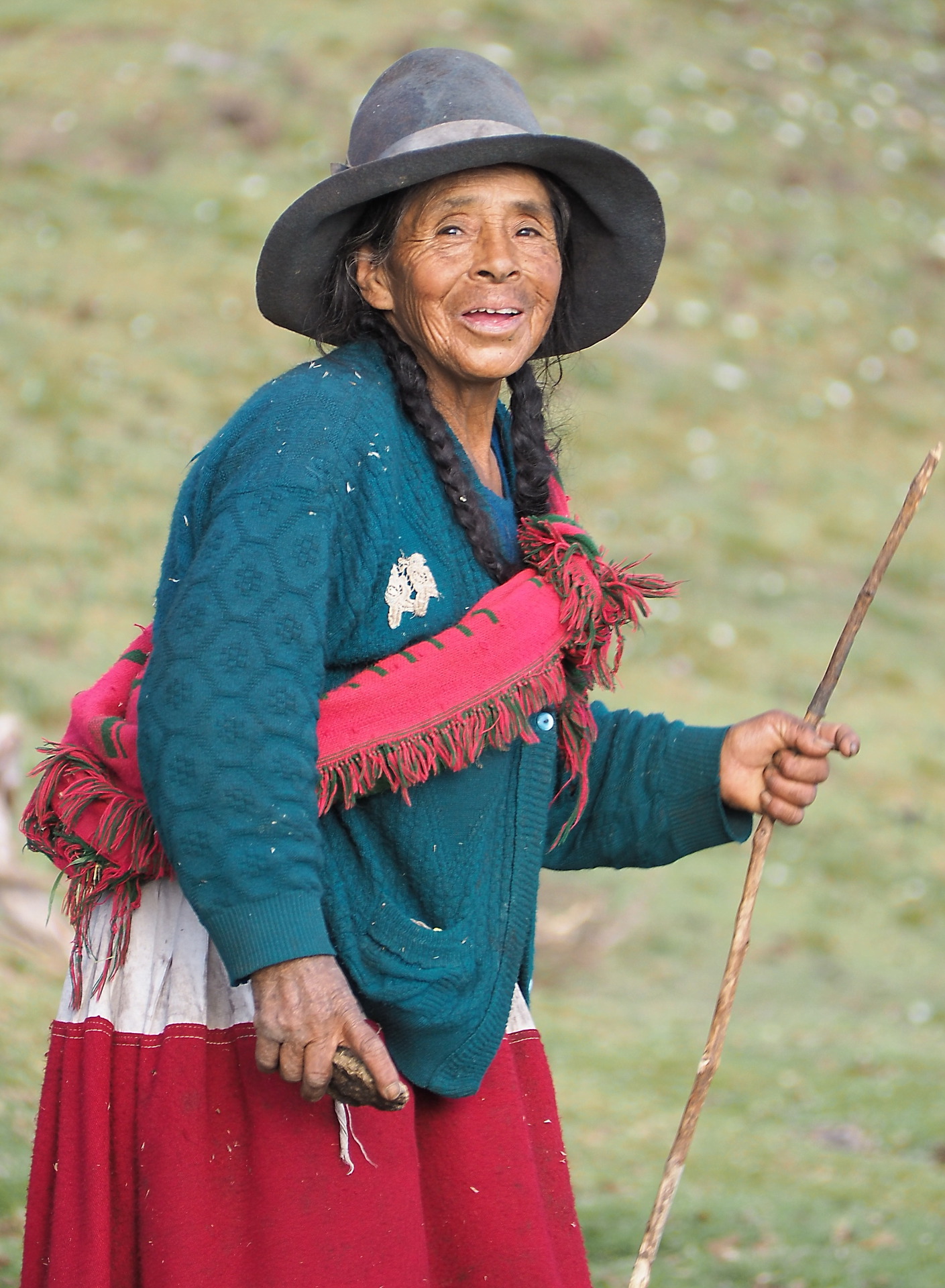 Okolní travnaté svahy přitahují i dobytek jedné postarší Peruánky. Dáváme se s usměvavou ženou do řeči, docela krásně se s ní povídá, jen netuším, o čem hovoříme. Naše stany zajímají krávy i ovce natolik, že neváhají sejít ze všech okolních svahů k nám na louku a trpělivě stát kolem a čumět. V podvečer se paní marně několik desítek minut snaží své stádo usměrnit. Nutno říct, že v hodu hovnem na cíl by určitě byla mistryní světa. Co hod, to zásah. Ale účinnost její metodě jaksi chybí.