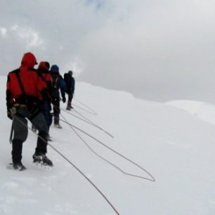 Ráno jsme zaspali. Vstali jsme až v 6:00 ale už v 7:45 vyrážíme. V domku necháváme batohy a odcházíme nalehko. Jdeme hřebenem (2B) na Sněžnou. Sníh je po tom větru pěkně tvrdý, takže se vůbec neboříme a běžíme docela rychle. Vítr je pořád dost silný, má to ale i výhody. Lano je mezi námi skoro vodorovně a tak se aspoň nemotá pod nohy. V tom větru to vypadá dost drsně, ale jenom jako. Nahoře stihneme zase jenom pár rychlých fotek a sestupujeme normálkou dolů. Zpátky v domku jsme v 10:15. Tuhle túru píšou v průvodci na 5-6 hodin.