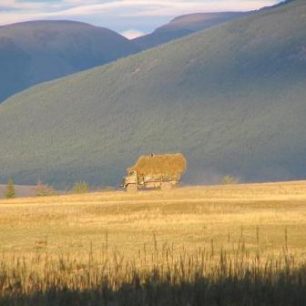 Ráno k brodu přijde mladý Rus. Trochu s ním pokecáme, ale je dost zmatený. Snad se narodil v Čechách. Kolem 11:00 už slyšíme, že zemědělec nastartoval svůj stroj. Za chvíli ho už i vidíme. Naskládáme se na korbu historického náklaďáku a jedeme do Kuraje.
