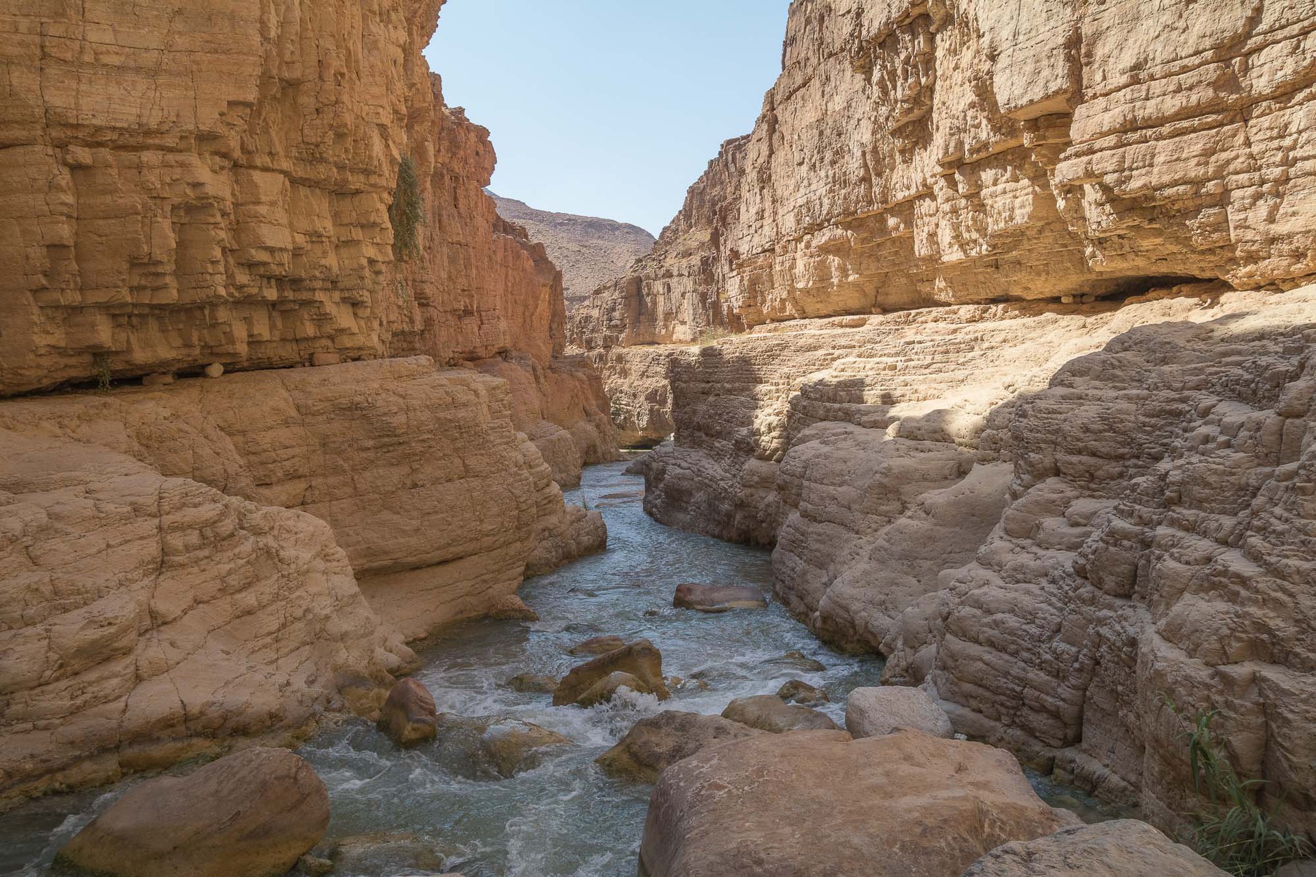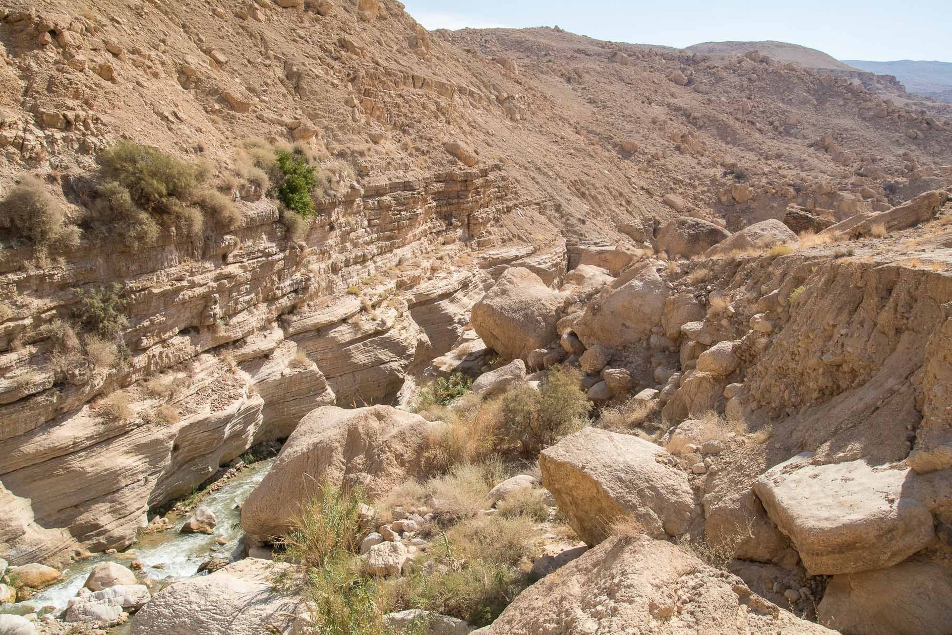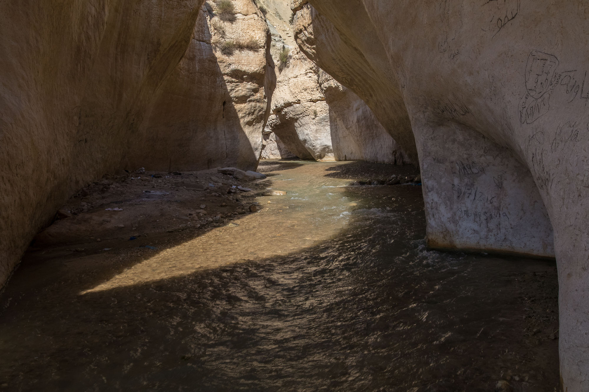 Další den pokračujete podél proudu. Po přibližně hodině chůze narazíte na úzký kaňon z levé strany. Pokud půjdete asi 50 m tímto kaňonem, narazíte na malé studené jezírko, kde je možné se zvlažit. Pokračujte hlavním tokem. Údolí se zúží a říčka je brzy lemována několik set metrů vysokými pískovcovými stěnami a cesta je zcela zřejmá. V několika místech je nutné opustit dno kaňonu a překonat krátké úseky po skalních plošinách. Zde sledujte „mužíky“ postavené místními beduíny. Asi po 4-5 hodinách chůze je na levém břehu kamenný útvar připomínající ponorku. Pokud se již stmívá, je zde možné na skalní plošině postavit stan. Asi 2 min chůze od tohoto útvaru zleva vlévá do říčky potok končící asi 3 m vodopádem, vhodný k nabrání vody na pití. Nad tímto vodopádem potok tvoří jezírko se studenou vodou. Po dalších dvou hodinách pískovec vystřídá na zhruba půl km dolomit. V půli tohoto dolomitového kaňonu tok zahýbá v pravém úhlu doleva a v úseku zhruba 200 m zvětšuje svůj spád. Opatrně pokračujte po pravé straně toku, kde je síla proudu nejmenší. Po dalších dvou hodinách je říčka přehrazena obrovským balvanem. Úsek projděte korytem říčky. Pokračujte další 2 hod a tok je opětovně zablokován obrovským balvanem. Úsek zdoláte po pravé straně kaňonu přes asi 3 m vysoký skalní stupeň. Po dalších 30 min chůze kaňon končí a váš trek je u konce. Vesnice Sufi, kde je možné objednat si odvoz či nakoupit jídlo, je vzdálená dalších 10 min chůze. Kolem vesnice vede Dead Sea highway.