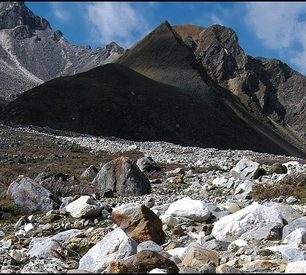 Po několika dalších hodinách putování stále řidnoucí tajgou konečně opouštíme les. Pomalu mizí zakrslé modříny a na scénu přichází hory. Vstup do vysokohorské doliny Eche Ger (česky Velká plošina nebo step) je skutečně impozantní. Ostré skalnaté štíty tvoří slavobránu širokému, trávou porostlému údolí, jimž protéká divoká říčka. Čím výše stoupáme, tím jsou hory velkolepější. Podobnost s alpskými velikány je skutečně značná, zde je navíc obohacená o skutečně asijský rozměr. Dobře znatelná stezka stoupá až téměř do závěru doliny, kde je však nutné nepřehlédnout odbočku k sedlu Šumak, mířící do východní odnože doliny.