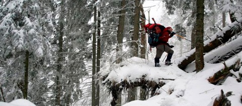 Stoupání si ale brzy vybralo svou daň. Běžky vystajlovaně upnuté k batohům se zachytávaly do větví stromů a strhávaly na své majitele metráky čerstvého prašanu. Svah, příliš strmý na sněžnice a příliš mírný na normální stoupání, byl pokrytý sněhem tak, aby dostatečně klouzal, a umně kryl všechny kameny, kmeny, kmínky a komínky šutrů, po kterých se nejistá noha smekala jako zubařský hák po zubním kameni.