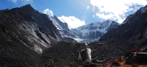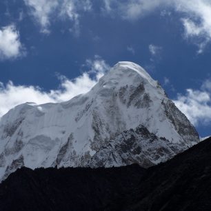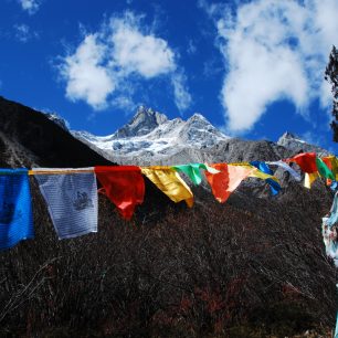 Kde je ona fádnost krajiny, kterou jsme se sem busem a nyní autem trmáceli!? Před námi ční zubaté vrcholky pokryté ledem, lesy a loukami hrajícími odstíny zelené. Scenérie je tak dramatická a úchvatná, že se nemůžeme nabažit a pohled odvrátit jinam! Celé skupině kralují dva vrcholy. Úplně nalevo Genyen a uprostřed dechberoucí skalní pyramida Cameron (5.873 m n. m.).