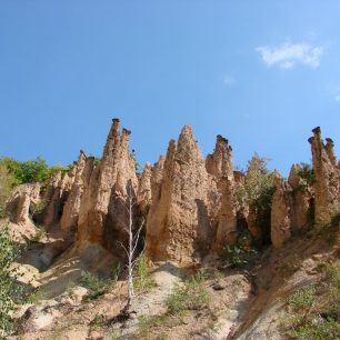 Po pauze na oběd padne rozhodnutí – nás přeci nezastaví, musíme dolů! Logicky sestupujeme pravou stranou, kopírujíc okraj srázu poměrně prudkým zalesněným svahem, nenacházeje ani ty nejmenší stopy pěšiny, natož značení. Tudy rozhodně málokdo šel. Představa, že se tudy budeme muset sápat zpět nahoru není zrovna povznášející. Po sestupu nejhoršího svahu objevujeme na druhém břehu vyschlého koryta potoka sotva znatelné zbytky staré pěšiny, kterou naposledy prošli zřejmě Titovi partyzáni. Nakonec se k velkému údivu svátečních návštěvníků vyloupneme z křovin přímo na vyhlídkovou trasu. Prohlídka bizarního přírodního výtvoru Ďáblova města opravdu stojí za to, tohle u nás nespatříme. Při fotografování se vztyčenou českou vlajkou na vyhlídkové věži uprostřed zemních pyramid se k nám hlásí zájezd ruských důchodkyň se slovy „bráťja čéši“.