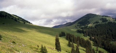 Po vystoupání svahu procházíme kolem několika obrovitých smrků a po dvou hodinách výstupu se dostáváme na okraj louky Roβwiese ve výšce 1420 metrů, z níž se ozývají zvonky popásajících se stád krav. Značka dál pokračuje pěšinou mírně zvlněným terénem středem louky k protilehlému okraji lesa, od něhož se pak po dalším kilometru chůze dostáváme na okraj rozlehlé náhorní louky Hinteralm, jejíž kouzelnou malebnost dokreslují stylové dřevěné salaše v její levé horní části. Mezi nimi je vsazena i horská chata Hinteralmhaus, jež slouží turistům jako výborná základna pro pěší výšlapy po okolí.