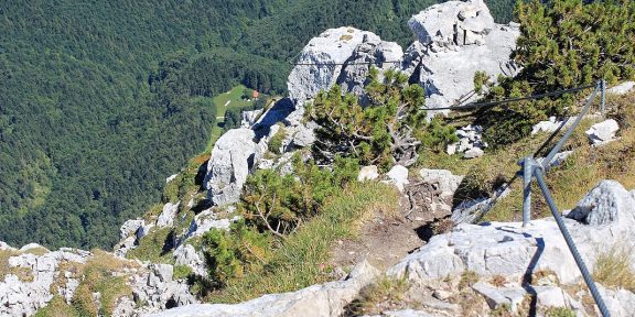 Sestup vedeme po normálním chodníku na louky Steiner Alm a po cestě sejdeme zpět do výchozího místa. Celkově těžké až velmi těžké, čas potřebný na samotný klettersteig je cca 3 hod., celkový čas okruhu 7 hod.