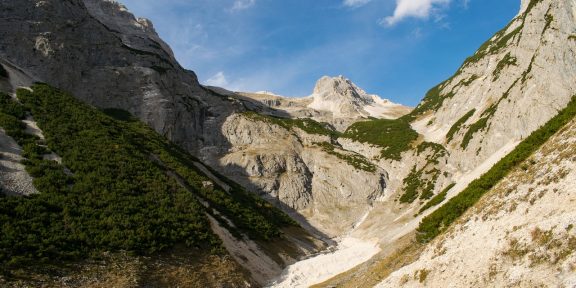 Druhý den nás čeká výstup na Birkkarspitze. Od chaty stoupáme nejprve k rozcestí pod mohutnou suťovou kotlinou Schauchkar. Normální cesta pokračuje právě tímto kotlem, ale cesta je únavná a ničím výjimečná. Výstup nám navíc v závěru výstupu mohou znepříjemnit (nebo dokonce znemožnit) dlouho ležící sněhová pole nebo ledu.