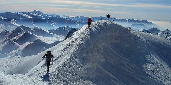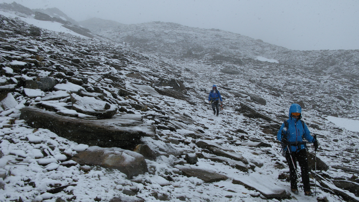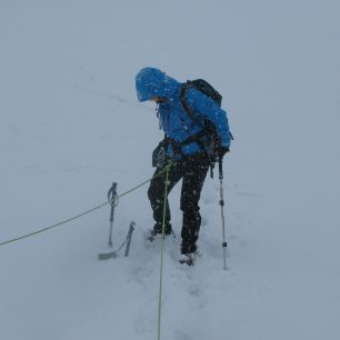 Doporučuji na hřebeni přejít z dlouhého navázání na ledovci na kratší rozestupy tak, abyste minimalizovali strhnutí a v případě pádu i vygenerování velké pádové energie.