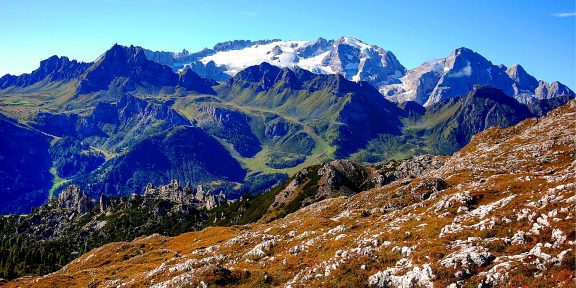 Marmolada (3343 m.n.m), nejvyšší vrchol Dolomit je zároveň jedinou dolomitickou horou, která se chlubí ledovcem. Přitom vůbec jako správný kus dolomitu nevypadá – především při pohledu od severu – což je vlastně pro vyznavače ledovcové turistiky a zajištěných cest dobře, protože Marmolada nabízí unikátní kombinaci obojího a ještě se túra nechá zvládnout během jediného dne „nalehko“.