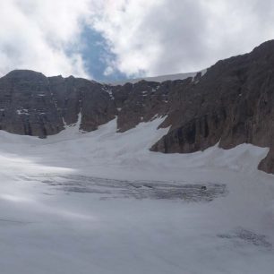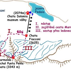 Sestup jsme zahájili s mačkami na nohou po sněhovém poli severozápadním směrem. Stopa v bezpečné vzdálenosti sledovala příkře spadající severní svah a zavedla nás až nad sestupovou spáru na ledovec Marmolada. Sestup po skále je v současné době jištěný fixním lanem a v podstatě je ferratou jednoduché obtížnosti. Ledovec Marmolady je rozpraskaný, společný postup lanového družstva je tak základním bezpečnostním opatřením. Podobně jako na vrcholu i zde jsme mohli na jedné straně těžit z čistě bílého sněhu, který napadl dva dny před naší výpravou, na druhé straně však už byla stopa od předešlých výprav prošlápnutá a neměli jsme problém s orientací. Praskliny jsme obešli z východu a k chatě Fiaconi jsme přišli akorát chvilku před pátou, abychom se ještě stačili svézt k parkovišti u jezera Fedaia. Sestupová trasa se nechá v případě potřeby využít i pro výstup. Tuto variantu je možné zvážit z časových důvodů nebo pokud je hlav ferrata na západním hřebeni pod sněhem.