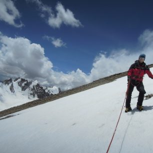 Ve vrcholový den budík zvoní jen pár minut po třetí hodině ranní a rozbřesk už sledujeme ve značné výšce nad dnem údolí pod námi. Sotva se doradujeme z krásného přírodního úkazu v podobě východu slunce nad Himálajem, střídá radost zklamání. Ve tmě jsme trefili špatné suťové žebro, a tak nám nezbylo než sestoupit na ledovec pod námi, přetraverzovat jej a pokračovat vhůru po vedlejším, zlehka sněhem pokrytém hřebeni. Téměř až na vrchol by sice šlo dojít po suti, vzhledem k její soudržnosti se však rozhodujeme k chůzi v mačkách po přerušovaných sněhových polích. I když rád přeháním, a co se hor týká dvojnásob, musím podotknout, že cesta až na samý vrchol nebyla nic než „choďák“. Ale „choďák“, který dokáže dát zabrat. Přeci jen, ve výšce okolo šesti tisíc je řidší vzduch už setsakra znát, a tak jsme poslední metry před vrcholem ukrajovali velmi pomalu. Dřina stála za to, dostali jsme, co jsme chtěli: jednoduchý vrchol bez lidí a GPS ukazuje 6047 metrů.