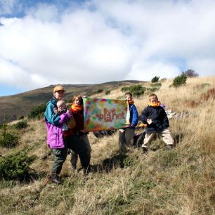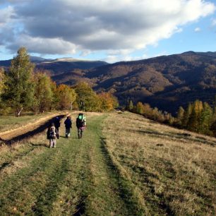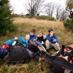Stezka pokračující na hřeben je často sotva znatelná pod spadaným listím, ale podle mapy dokážeme určit její další směr. Slunko nás nutí odkládat další a další vrstvy oblečení. Po poledni stojíme na travnatých loukách dlouhého hřebene, odpočíváme a cpeme se brusinkami, které jsou úplně všude. Na další dny nás už nečeká žádné velké stoupání, jen cesta po vrcholku hřebene. Pod námi je malé sedlo a podle mapy i pramen, zkrátka ideální místo pro přespání. Na jih od nás slunko barví hory do tisíců podzimních odstínů a od severu pomalu přichází mraky a jako měkká peřina se převalují sedlem a přikrývají náš stan. Jak krásně a měkce se usíná v horách. I kluci jsou spokojení, okouzlení, unavení.