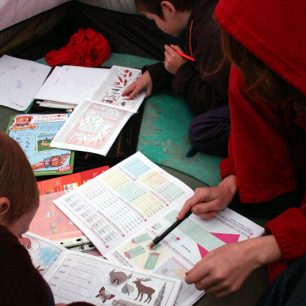 K větru se přidává ještě pršení a viditelnost je pořád jen na pár metrů. Kolem nás tušíme jen travnaté louky a uprostřed nich dvoustopá vyjetá cesta, po které jdeme. A kde je vlastně náš hřeben? Šlapeme, mokneme, šlapeme, mokneme, nic nevidíme. S mapou už nemá cenu nic konzultovat a ani můj průzkum nalehko několik kilometrů napřed po cestě nepřináší žádné rozuzlení. Víme jen, že jsme někde na severní straně od hřebene na hranici lesa a luk. Kde a kolik jsme vlastně ušli, těžko říct. Nejde než si přiznat, že jsme se ztratili. Takže rychle postavit stan a z mokrého oblečení si přelézt do teplých spacáků. Uvaříme teplé jídlo a než se setmí, ještě stihneme i několik příkladů z učebnice matematiky. To je jedna z výhod učení „doma“. Za ošklivého počasí přijde na řadu škola a když je hezky, je pak dost času na nekonečné běhání venku. Věříme, že zítra bude lépe a najdeme tu správnou cestu.