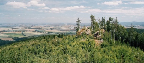 Rovněž půldruhého kilometru po červené značce, avšak opačným směrem měří odbočka k vyhlídkové skále Vysoký kámen (691m.n.m). Široké panoramatické výhledy na polskou rovinu, vymodelovanou nesčetnými remízky či stromořadími, oddělujícími jednotlivé pozemky, mezi nimiž se třpytí vodní hladiny jezer Otmuchowskie a Nyskie, jsou dostatečnou odměnou za absolvování této tříkilometrové zacházky. Patří k ní i pohled na hřebeny Rychlebských hor, táhnoucích se do dáli k pohoří Hrubého Jeseníku, z něhož vyčnívá do dáli viditelný vrchol Pradědu (1492m.n. m) s televizním vysílačem.